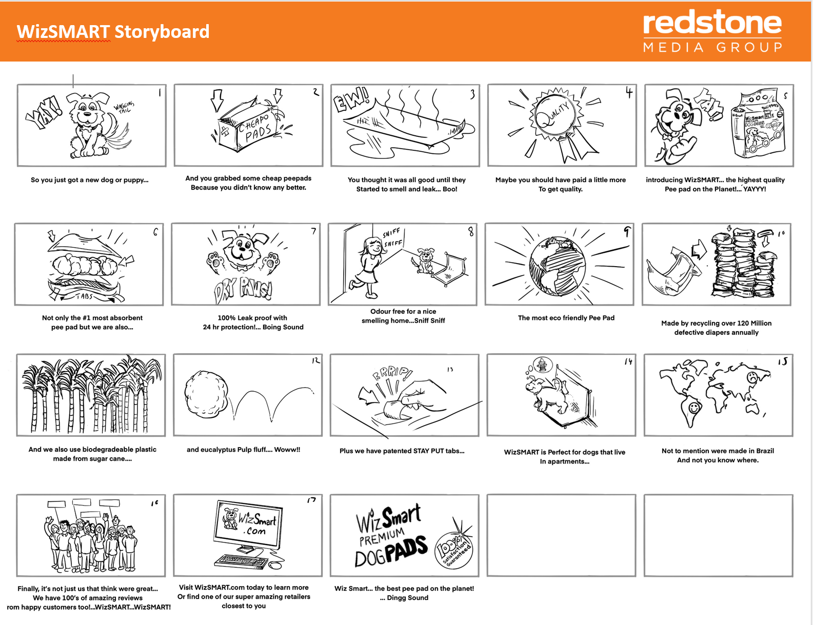I was involved in this script-writing process with my boss, Tim Hockley, as well as other writers at Redstone Media Group. We went over the goals of the video which were to introduce WizSmart pee-pads to a North American audience in sync with new distribution the company was launching. After some discussion we landed on a strategy of a brightly-coloured ad with impactful animation of the product's selling points supported by live-action footage of a main character enjoying the benefits of the "best pee-pad in the world". After a draft of the script was created, I was tasked with storyboarding and planning the schedule of production for the advertisement.